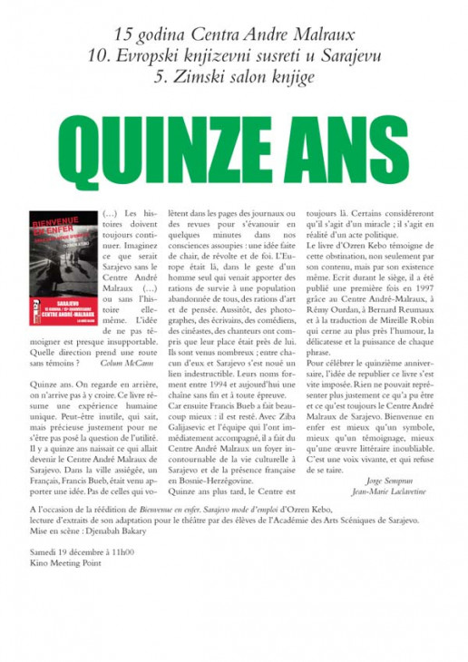 Pour célébrer le quinzième anniversaire, l’idée de republier ce livre s’est vite imposée. Rien ne pouvait représenter plus justement ce qu’a pu être et ce qu’est toujours le Centre André Malraux de Sarajevo. Bienvenue en enfer est mieux qu’un symbole, mieux qu’un témoignage, mieux qu’une œuvre littéraire inoubliable. C’est une voix vivante, et qui refuse de se taire.